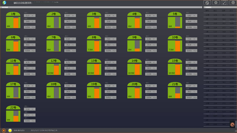 經(jīng)過(guò)一翻努力,終于把傳感器的通訊資料、每個(gè)傳感器的485地址、波特率都給弄清楚了,于是將這些信息錄入我們的系統(tǒng),然后再將畫(huà)面與傳感器的數(shù)據(jù)一個(gè)一個(gè)對(duì)應(yīng)好,再經(jīng)過(guò)一翻通訊測(cè)試便大功告成了,客戶(hù)又可以通過(guò)電腦查看到每個(gè)油罐的液位、溫度等信息了,而且還將報(bào)警人性化,用不同顏色來(lái)代表油罐的狀態(tài),這樣還沒(méi)到電腦前面就能一眼看出來(lái)了,如圖: