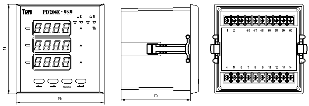 PD204E-9S9的外形和同系列的PD204E-9S4、PD204E-9S7一樣,都是96*96毫米,開孔也是一樣的91*91毫米,安裝方式同為屏裝。